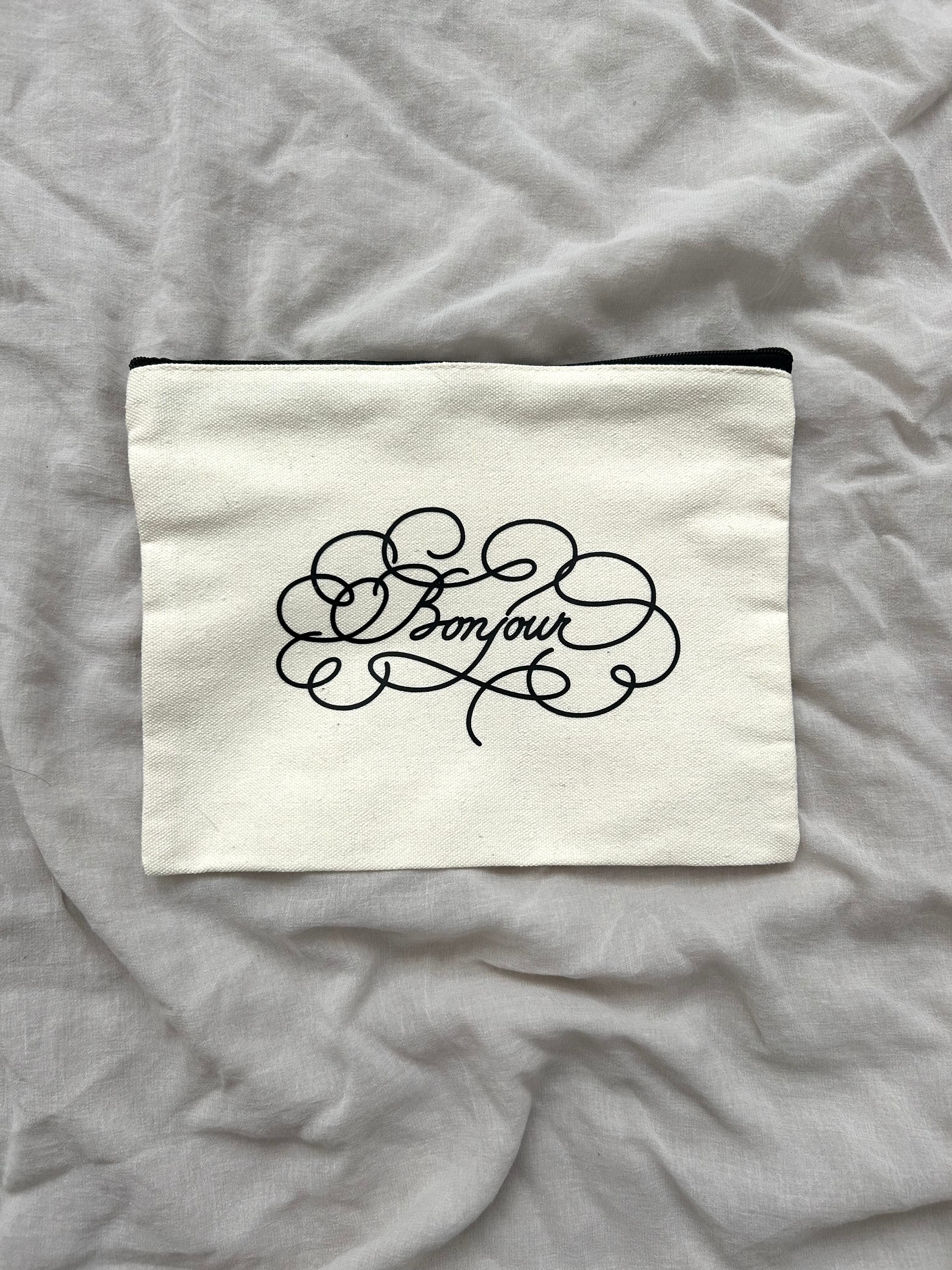 手書き文字で”Bonjour”を書いたのコットンポーチです。