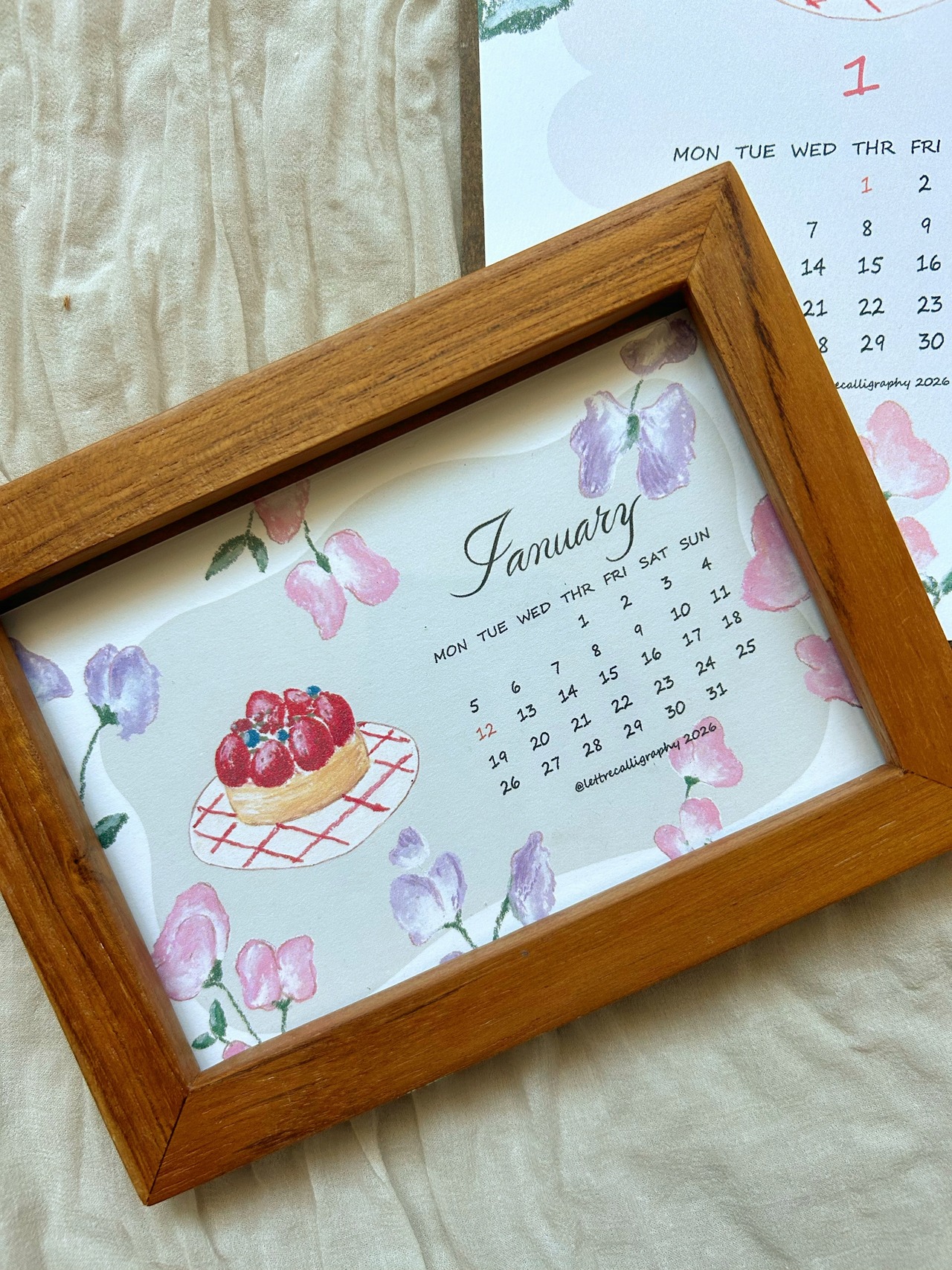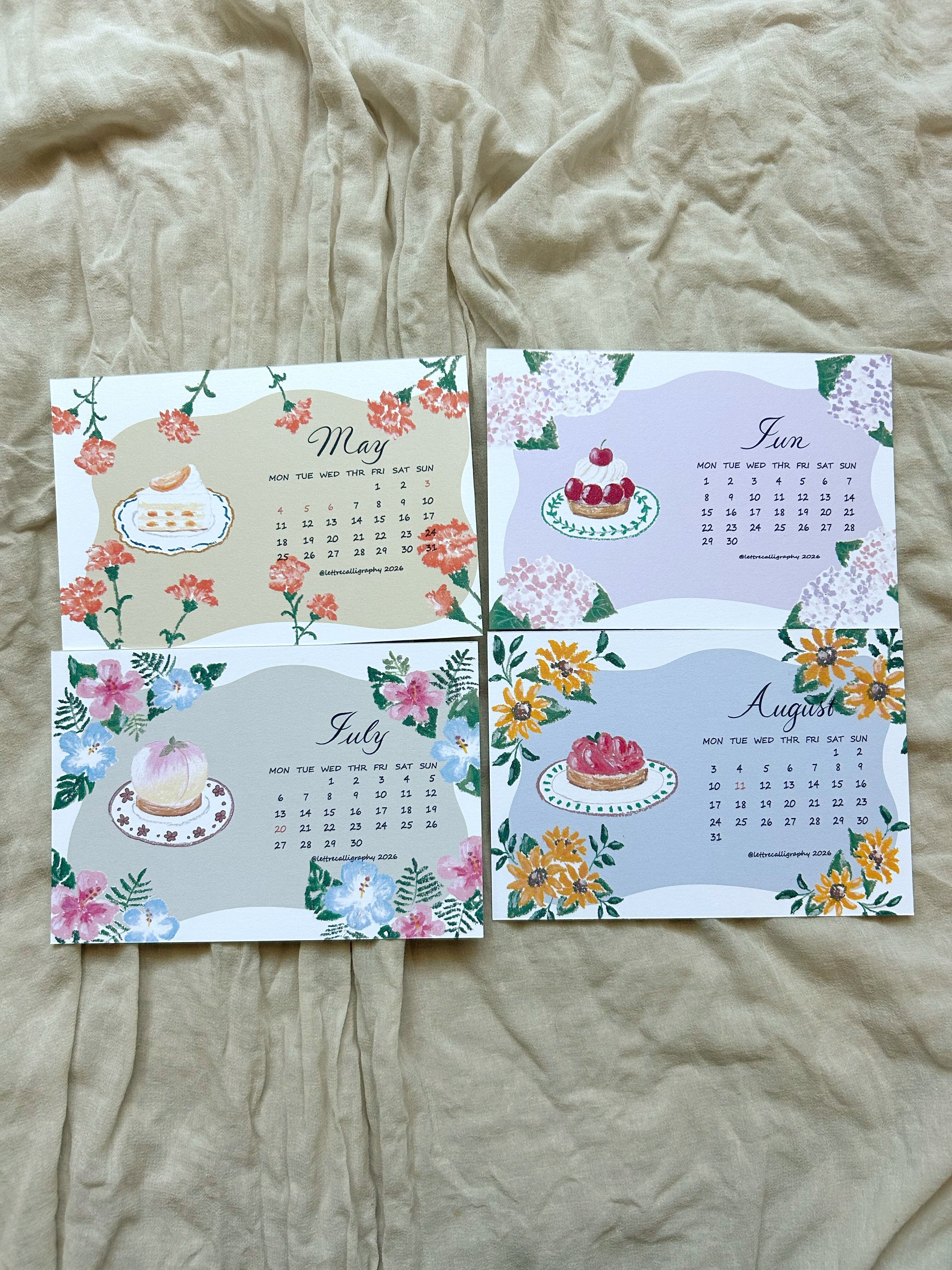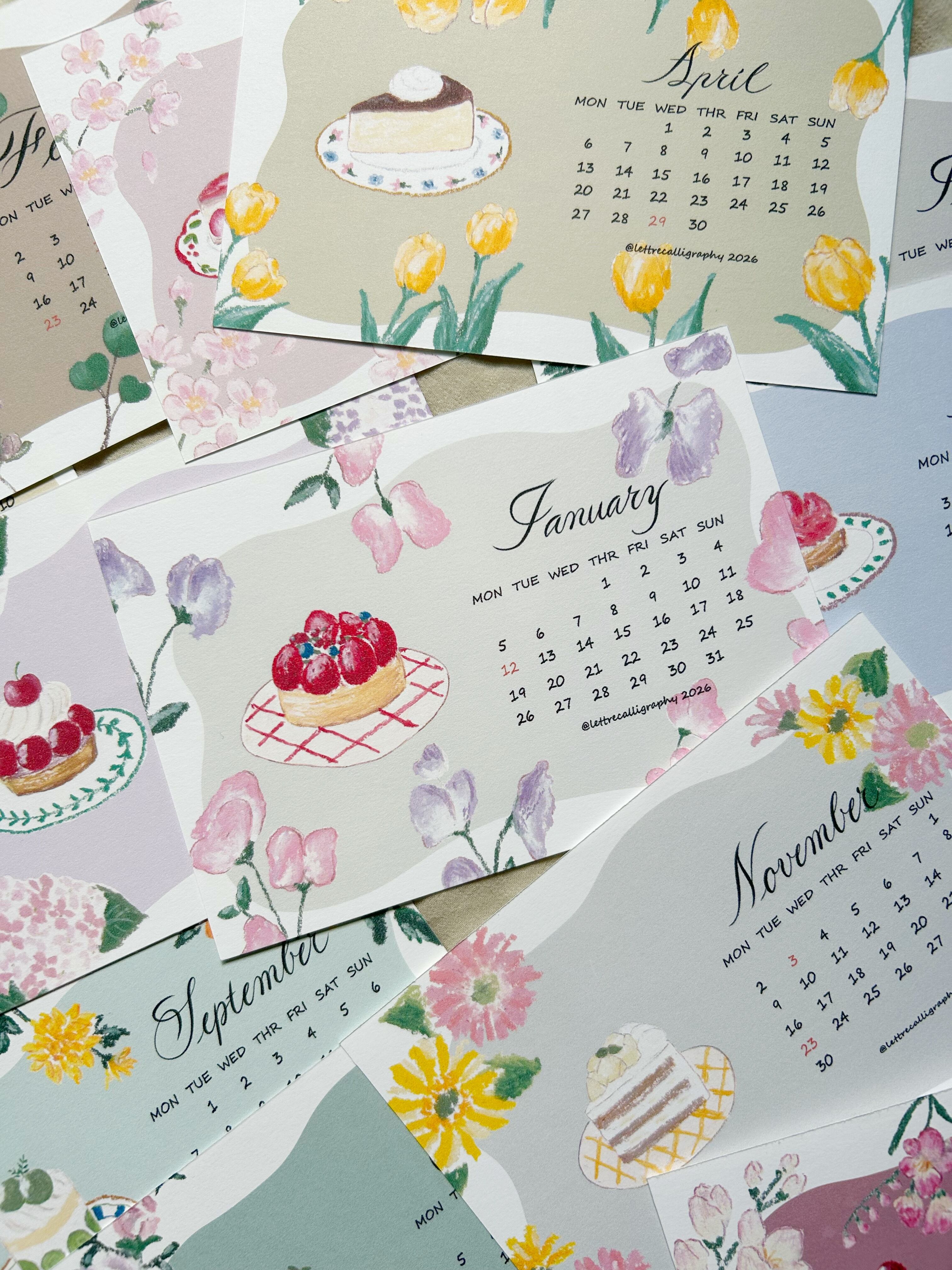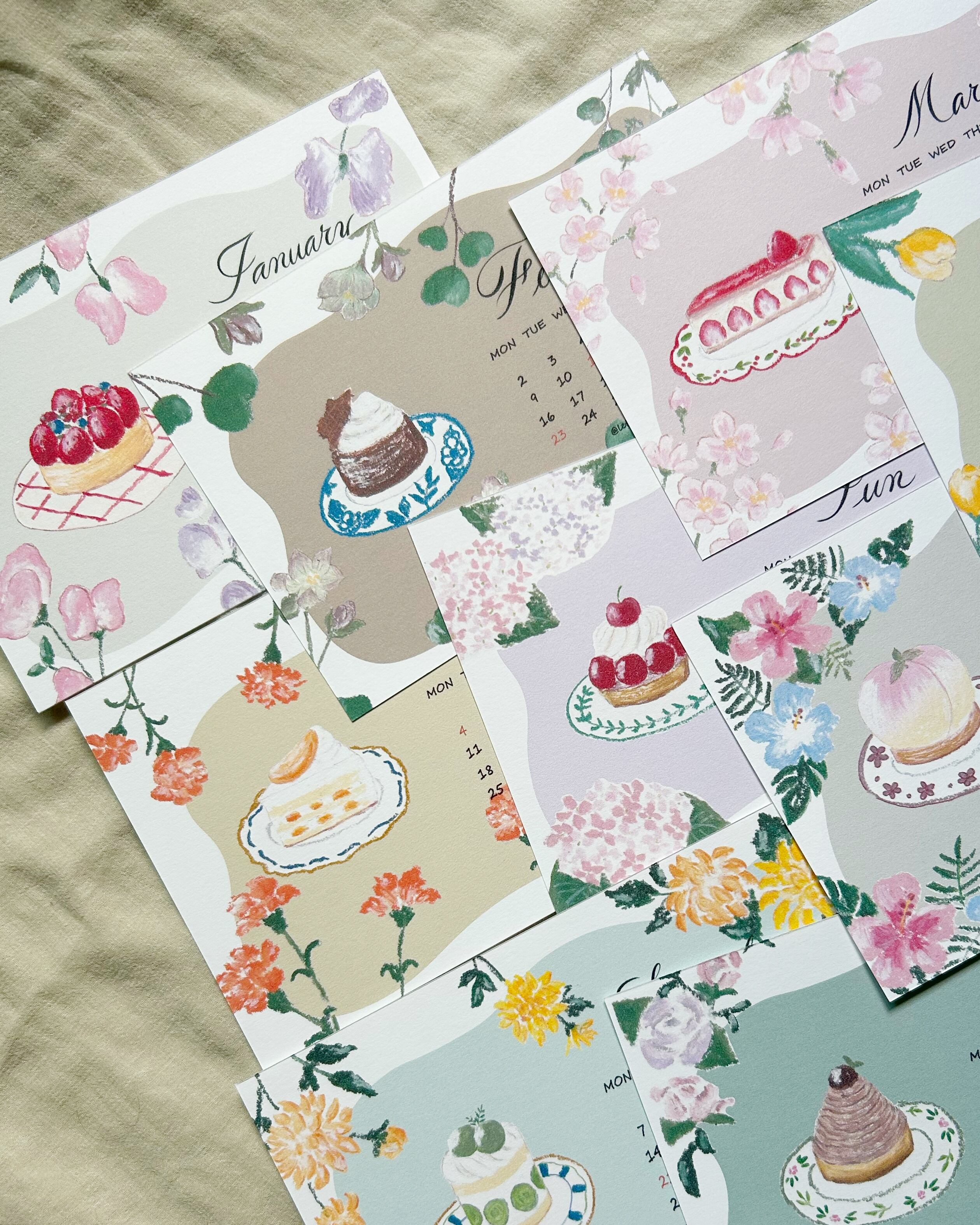 オイルパステルで描いた花とケーキイラストのカレンダーです。